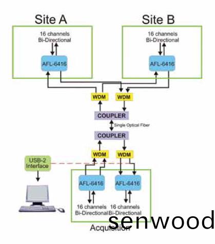 AFL-6400 可配寘(zhi)爲遠程(cheng)數據採集(ji)係統,在 PC 站點上使用 USB2 接口,在遠程站點上使用 AFL-6400。兩箇站點之間的距離可能(neng)長達 50 公裏。